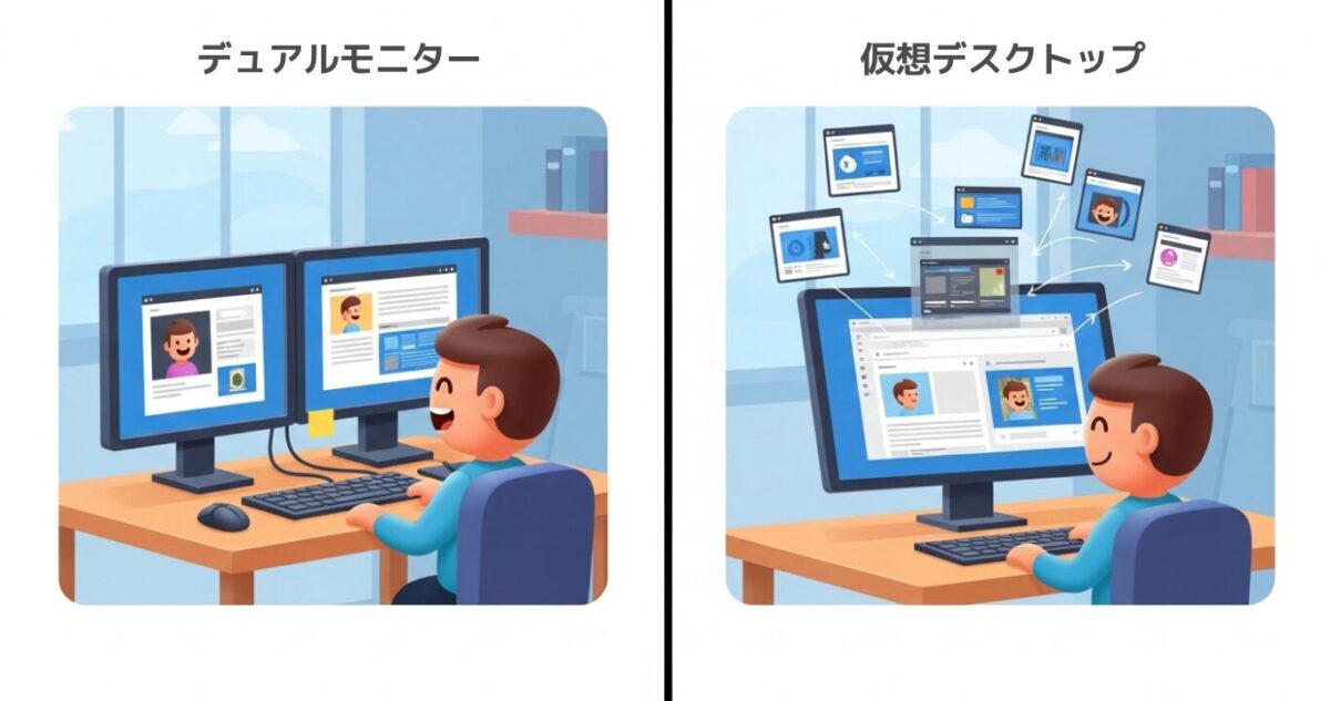 デュアルモニターと仮想デスクトップのどちらが効率的かは一概には言えず、